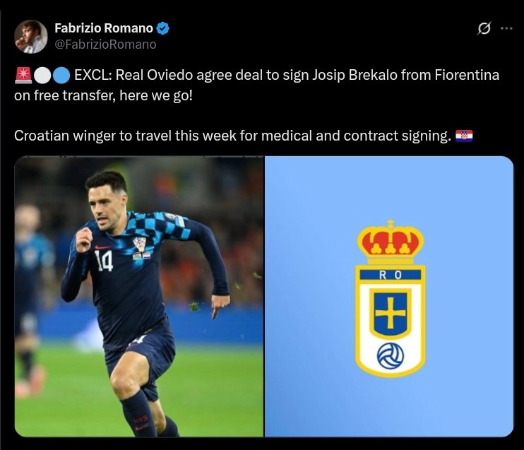 8月20日最新消息,知名转会记者罗马诺确认,克罗地亚攻击手布雷卡洛即将加盟皇家奥维耶多,交易已完成——Here we go!